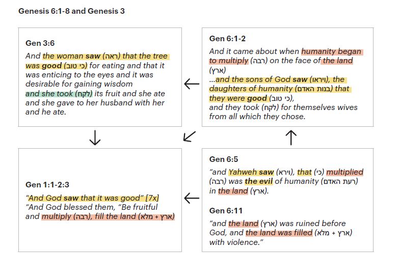 | God sees that it was good | The woman “sees” the Tree is “good” | The sons of God see that the daughters of humanity are good. |