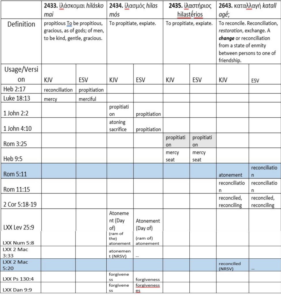 Notice that the KJV translates this word (καταλλαγή) as “atonement”, not “reconciliation”. Additionally, we have the case of Heb 2:17, where here the KJV renders a completely different word (ἱλάσκομαι hiláskomai) as “reconciliation” while the ESV has the more standard “propitiation”.